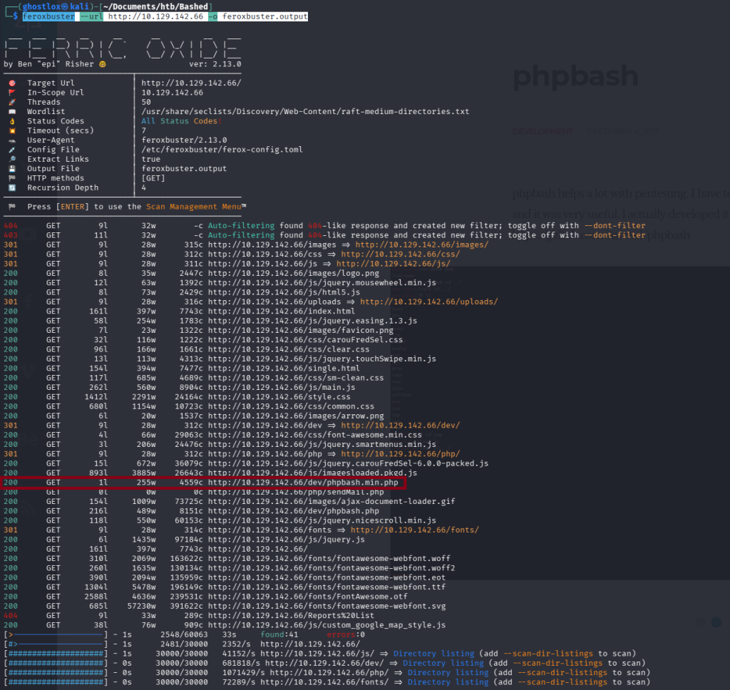 Highlighted in red, a HTTP 200 OK status was received for /dev/phpbash.min.php and a few lines below /dev/phpbash.php was identified also.
