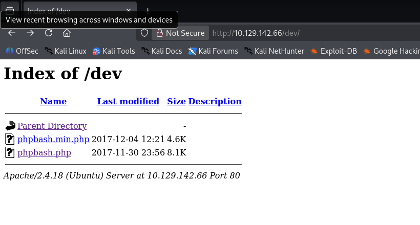 Out of interest, navigating to /dev shows directory listing is enabled in the Apache web app.