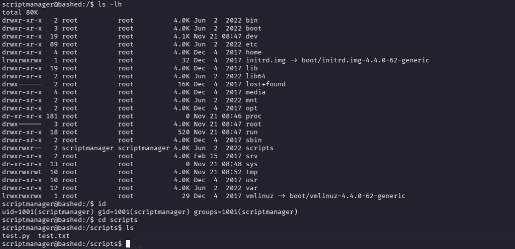 The scriptmanager user has permissions to read and write in the /scripts/ directory which is owned by scriptmanager and is in the group, scriptmanager. We can see a python script and text file exist.